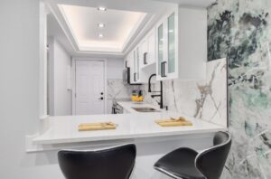 This beautifully designed open-concept living area combines functionality, comfort, and modern style into one seamless space. The light wood flooring and neutral color palette create a bright, airy atmosphere, while recessed lighting throughout the ceiling adds a clean, upscale feel. The living room flows naturally into the kitchen and dining areas, making it perfect for entertaining and everyday living. Soft furnishings and warm accent tones provide balance and coziness, while sleek built-ins and minimalist décor keep the space uncluttered and refined. Thoughtful layout planning maximizes openness without sacrificing defined areas, resulting in a space that feels both spacious and welcoming. This remodel reflects a perfect blend of contemporary design and practical living, tailored for modern lifestyles.