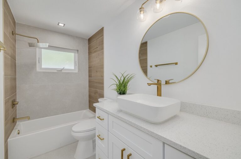 This bathroom remodel was designed to feel bright, modern, and effortlessly elegant while maximizing both comfort and functionality. Clean white cabinetry paired with a sleek quartz countertop creates a timeless foundation, while the gold fixtures add warmth and a refined,…