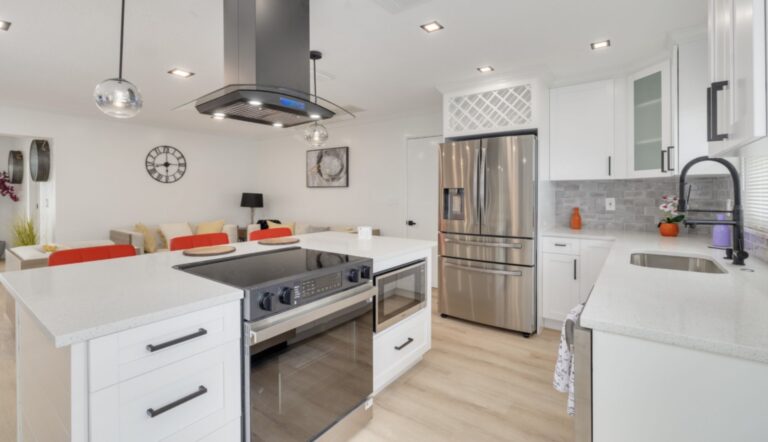 This modern kitchen renovation combines clean aesthetics with everyday functionality, creating a space that is both inviting and highly practical. Crisp white cabinetry paired with a sleek quartz countertop provides a timeless foundation, while the large custom island serves as…
